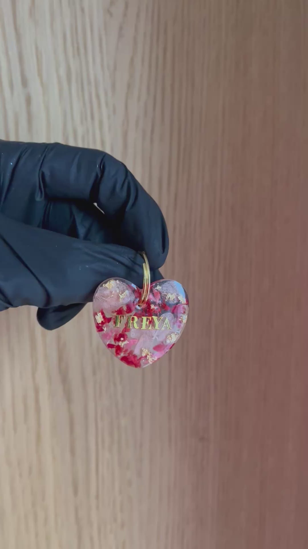 Le modèle “Pétales Pourpres” capture l’esprit d’un petit bouquet figé dans la résine : de vraies fleurs séchées dans des tons rouges, roses et rose très clair (presque blanc), relevées par quelques éclats de feuilles d’or. Résultat : une médaille élégante, lumineuse, qui attire l’œil sans en faire trop.