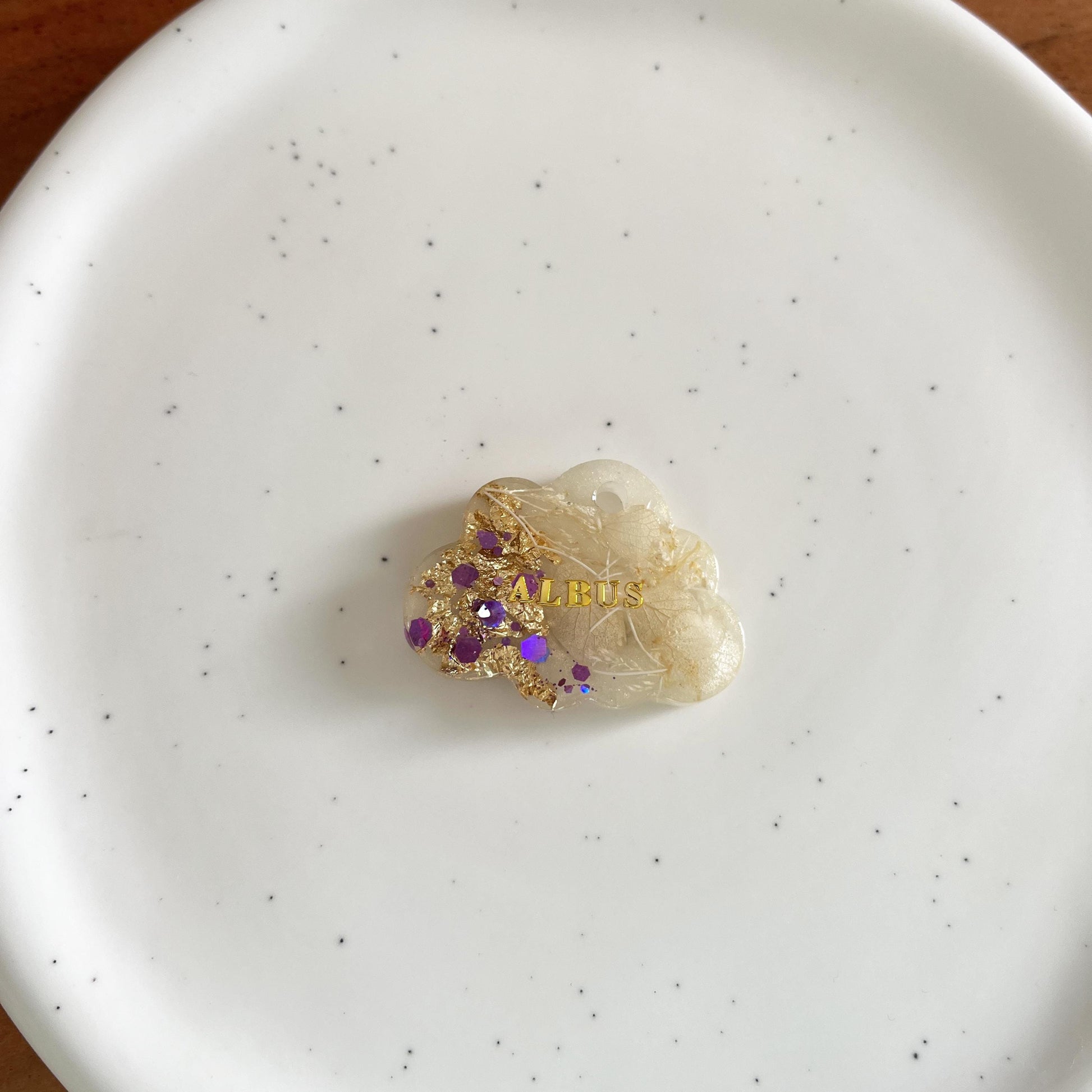 Une médaille d’identification lumineuse et délicate, réalisée en résine époxy avec fleurs séchées incluses et paillettes violettes. Personnalisation avec un prénom doré au recto, et numéro de téléphone au verso en option. Fabrication artisanale en France.