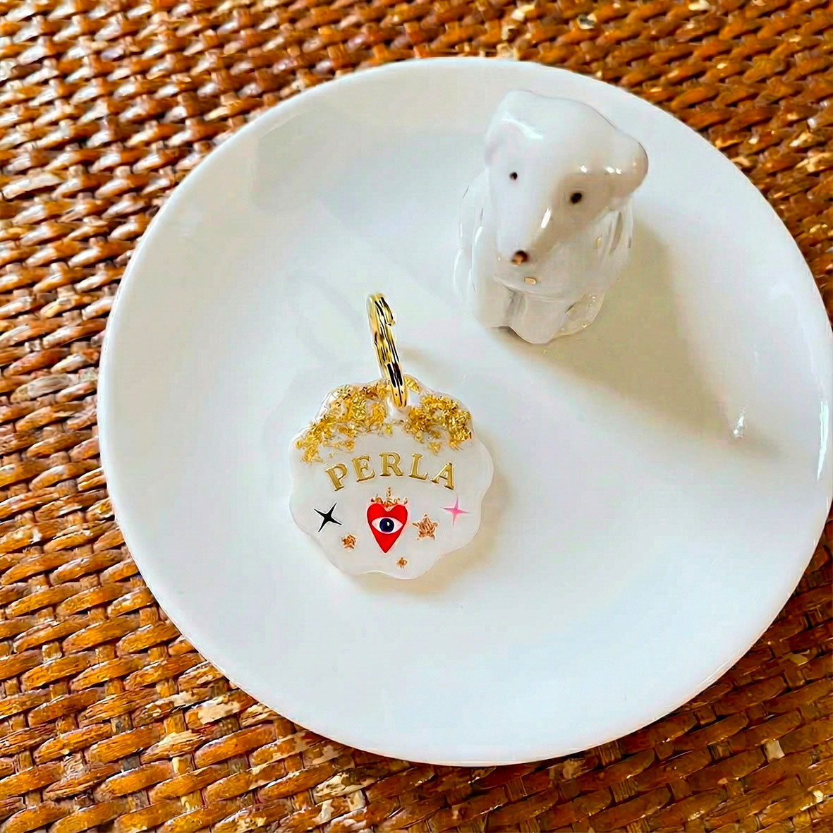 Médaille pour chien personnalisée en résine blanche – Cœur Oracle avec feuilles d’or & symboles