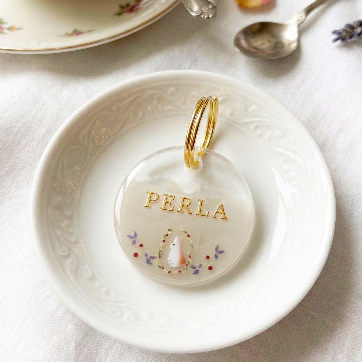 Médaillon chien personnalisé Lapin fleuri – Prénom doré (3 cm / 4 cm)