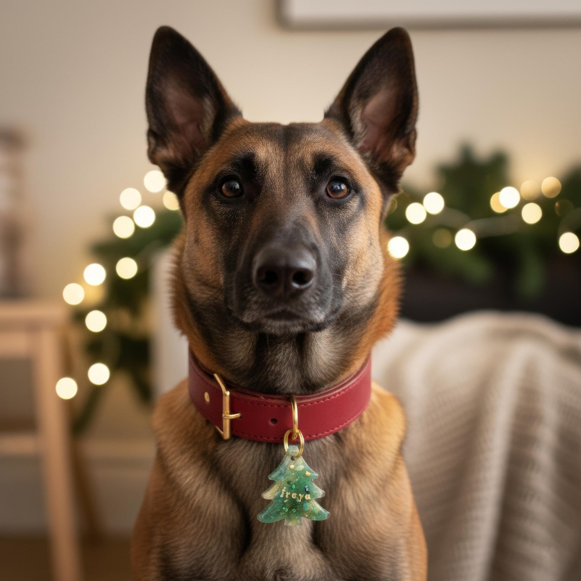 Médaille chien personnalisée - sapin vert, reflets dorés & inclusions scintillantes
